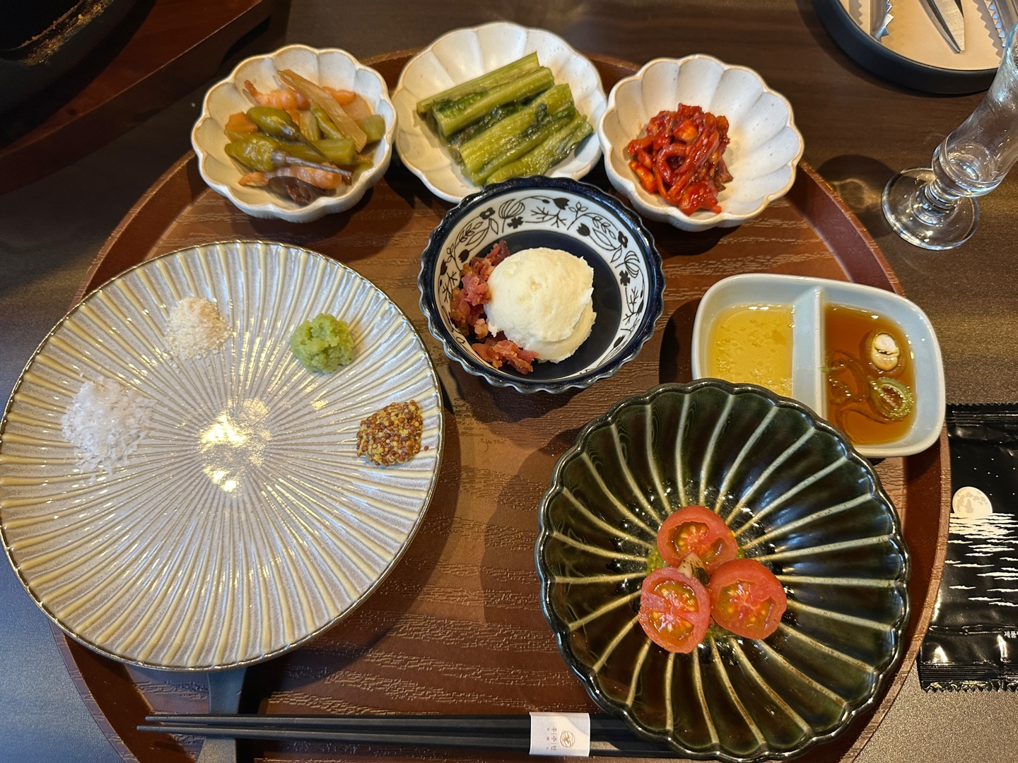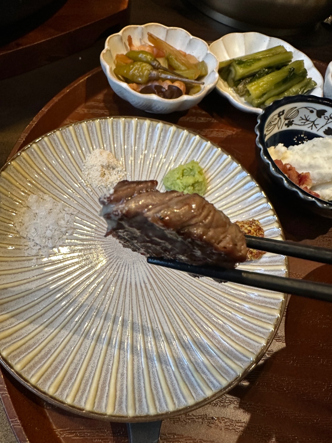 접시에 말돈소금, 트러플 소금, 와사비, 홀그레인 머스타드 순으로 놓여져 있구요.